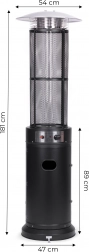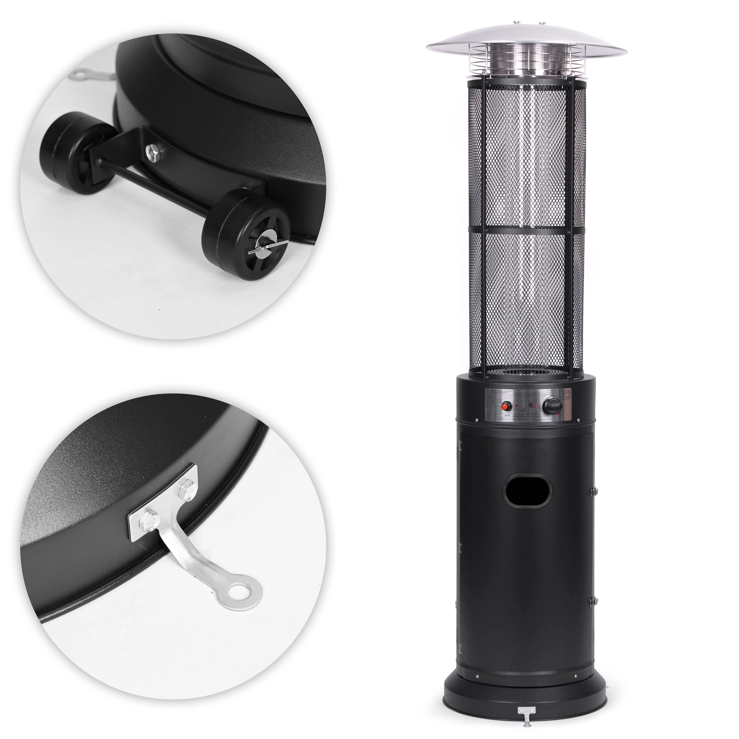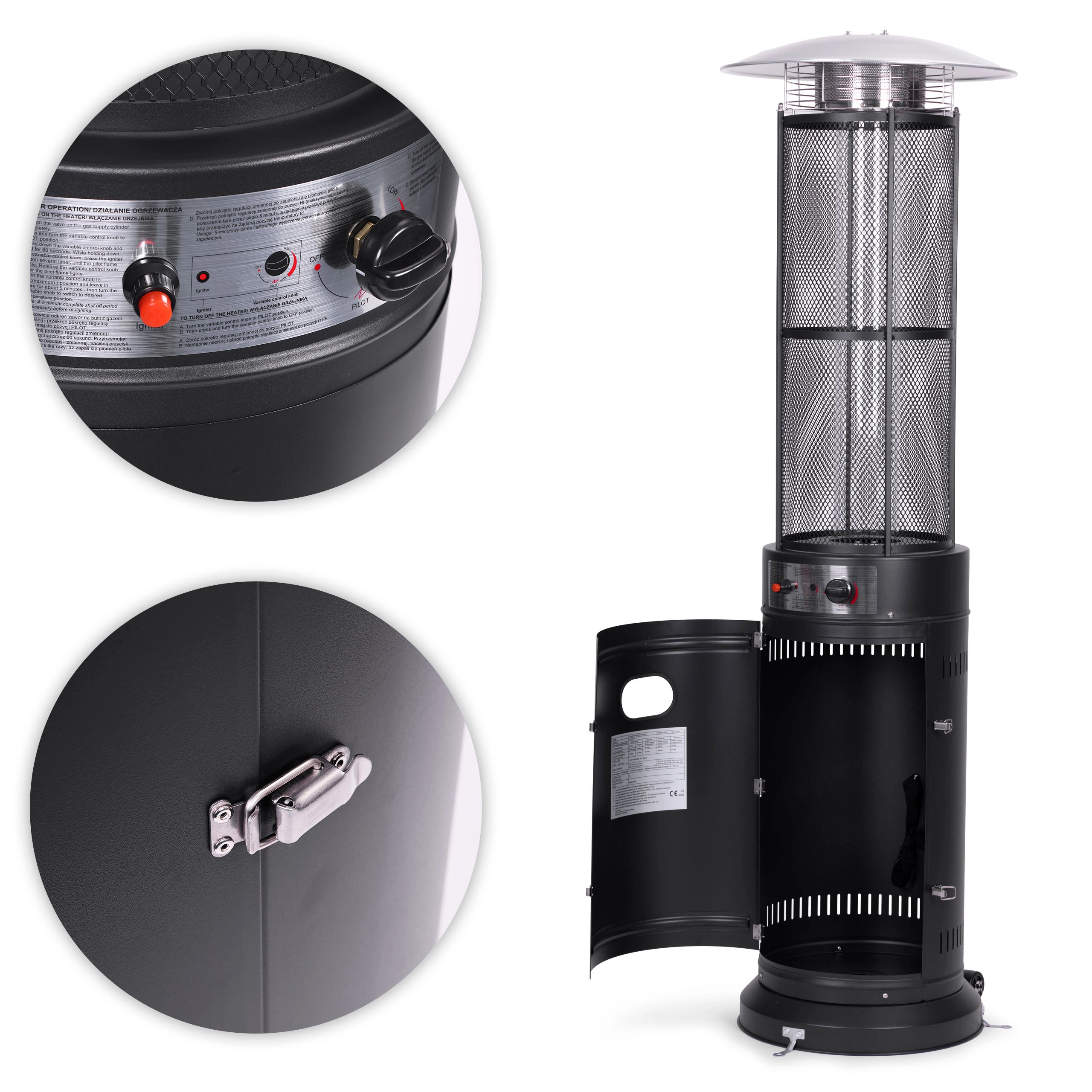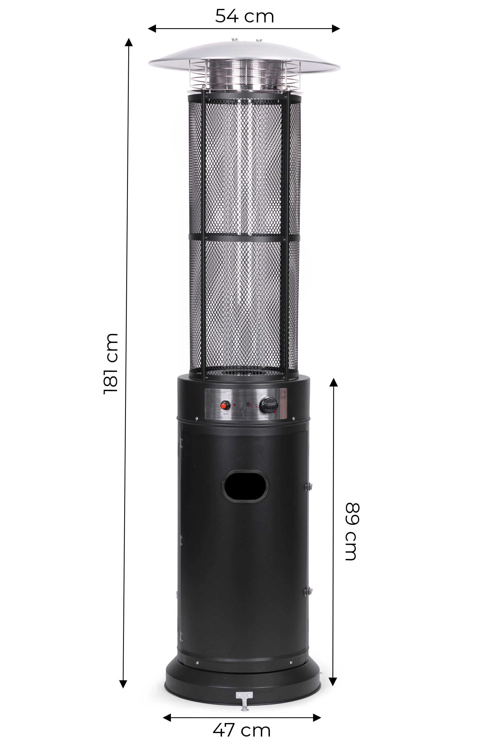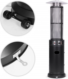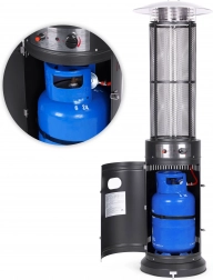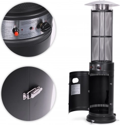 Bezpečné uložení lahve v uzamykatelném boxu, elektronické zapalování (1× AAA v balení) a stabilní práškově lakovaná ocel zajišťují pohodlný a spolehlivý provoz. Kolečka u základny usnadňují manipulaci a voděodolný ochranný obal chrání ohřívač před počasím mimo sezónu.