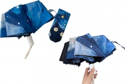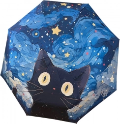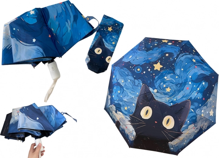 Automatický skládací deštník je ideální volbou pro každodenní užívání i cestování. Díky pevné a lehké konstrukci zajišťuje dlouhou životnost a odolnost proti silným poryvům větru. Tento deštník vzbuzuje pozornost svým unikátním designem s motivem černé kočky na modrém nebi.