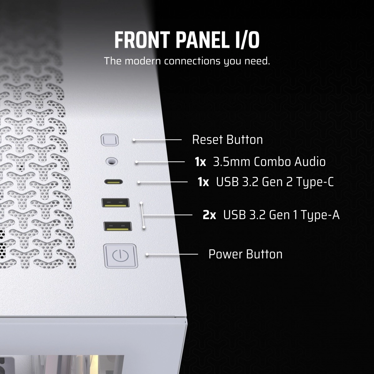 Přední panel zahrnuje port USB 3.2 Gen 2 Type-C, dva porty USB 3.2 Gen 1 Type-A a kombinovaný audio a mikrofonní vstup.