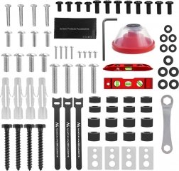 Součástí balení jsou i doplňkové montážní příslušenství jako kompaktní vodováha pro přesnou instalaci, odstraněné prachu pro vrtačku, čisticí utěrky a kabelové spony pro úhledné uspořádání kabelů.