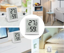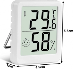 Kompaktní digitální teploměr s vlhkoměrem pro domácnost, kancelář i dětský pokoj. Nabízí přehledný LCD displej, ikonu pohodlí smajlík pro rychlé vyhodnocení klimatu, široký rozsah měření teploty a vlhkosti a napájení baterií CR2032 (součástí balení). Díky stojánku a magnetu jej snadno umístíte na stůl i kovové povrchy.