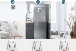 Praktická konstrukce umožňuje umístění na stůl pomocí integrovaného stojánku nebo přichycení na kov díky magnetu. Napájení zajišťuje běžná baterie CR2032 (v balení), takže je přístroj připraven k okamžitému použití.