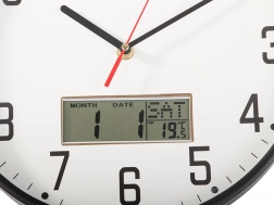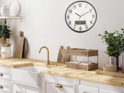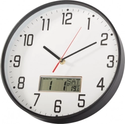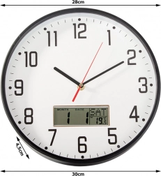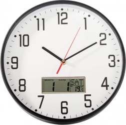 Elegantní nástěnné hodiny o průměru 30 cm kombinují klasický analog s přehledným LCD displejem. Nabízí tichý plynulý chod bez tikání, velké dobře čitelné číslice a elektronický ukazatel data a teploty. Díky univerzálnímu designu se hodí do kuchyně, obýváku, ložnice i kanceláře.