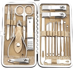 Kompletní 20dílná sada na manikúru a pedikúru v elegantním béžovém pouzdře pro každodenní péči o nehty a pokožku. Obsahuje nástroje ze nerezové oceli pro dlouhou životnost, precizní úpravu nehtů a pohodlné použití doma i na cestách.