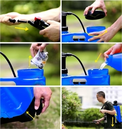 Nastavitelné ramenní popruhy rozloží hmotnost a aretační spoušť umožní nepřetržitý postřik bez únavy ruky.