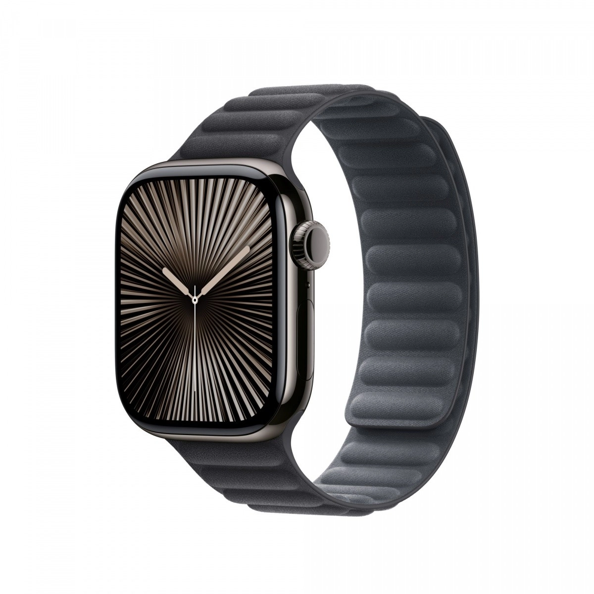 Černý žebrovaný magnetický řemínek, vyrobený z jemné textilie FineWoven, elegantně obepíná vaše zápěstí. Zvláštní tvarované magnety zajišťují, že řemínek zůstává pevně a pohodlně upevněn po celý den.