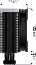 Měděné tepelné trubice s přímým kontaktem s CPU a husté, asymetrické žebrování efektivně odvádí teplo a zlepšují kompatibilitu s pamětmi.