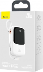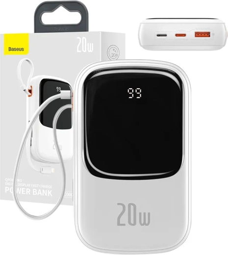 Baseus Qpow Pro je praktická a objemná powerbanka vybavená vestavěným kabelem Lightning, USB-C a USB portem. Umožňuje obnovit energii až třem zařízením současně s výstupním výkonem 20W.