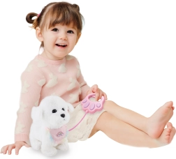 Tento měkký a přítulný plyšový pejsek o velikosti 22 cm přináší dětem spoustu radosti díky realistickým pohybům a zvukům. Kabel s ovladačem se připojuje do otvoru na krku a umožňuje jednoduché ovládání chůze a efektů. Díky kombinaci dotyku, tlesknutí a tlačítek je hra intuitivní a zábavná.