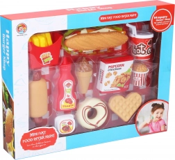 - Hranolky, bageta, nápoj, popcorn, párek v rohlíku, kečup, zmrzlina, koláček