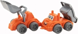 Díky kvalitnímu plastu a pevnému zpracování jsou hračky odolné vůči každodennímu používání. Sada obsahuje nakladač s funkční lžící a sklápěcí auto s korbou, které se skvěle doplňují při hraní na stavbě.