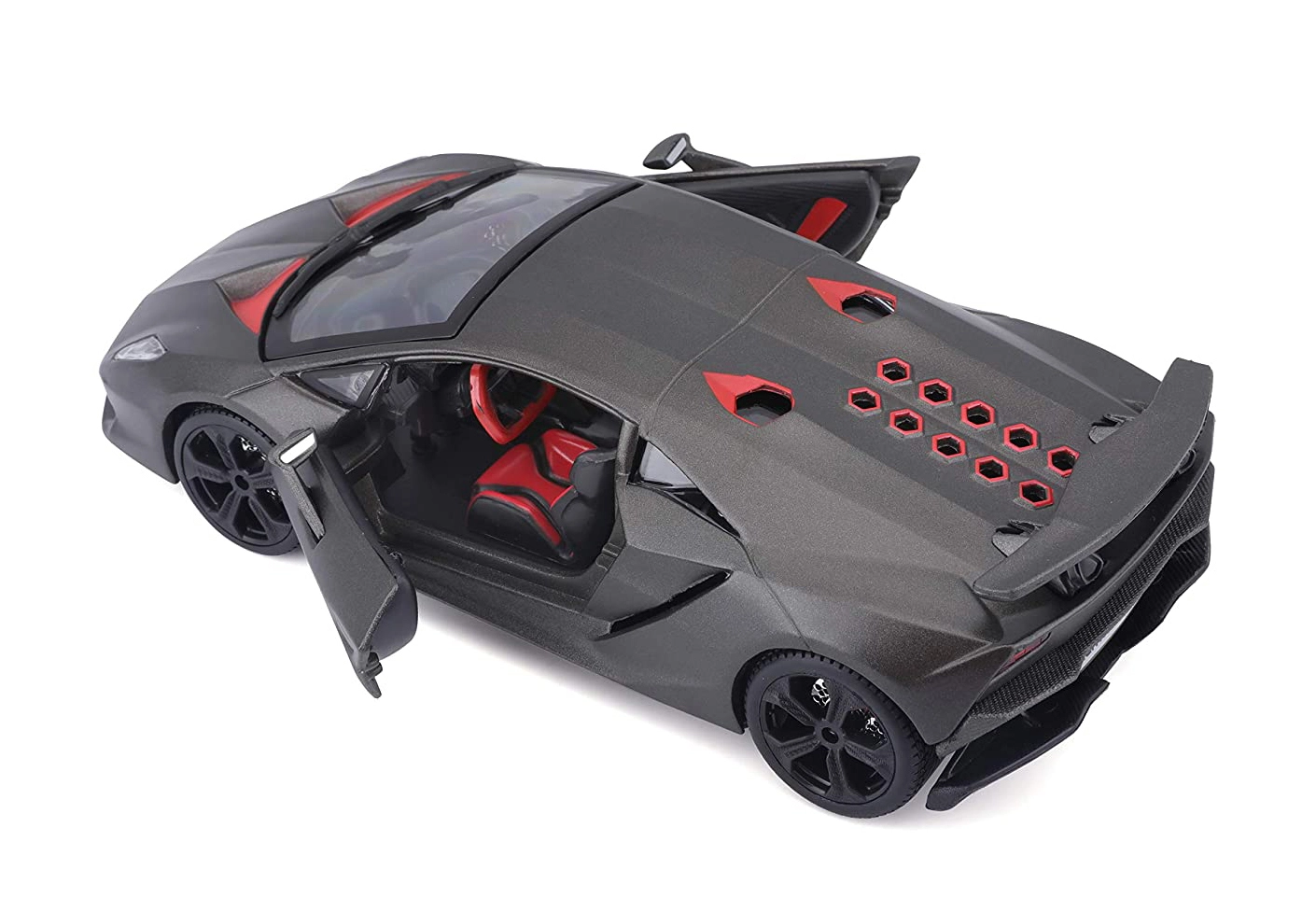 Prohlédněte si červeno-černý kokpit s precizními detaily sedadel, palubní desky a volantu – ideální pro výstavku i hraní.
