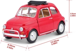 Model auta Bburago Fiat 500L (1968) v elegantní červené barvě nabízí realistické zpracování klasiky italského designu. Díky kombinaci litého kovu a přesných plastových doplňků působí model autenticky a odolně. Většina modelů v této řadě má otevírací dveře, kapotu nebo kufr, u vybraných verzí nechybí ani funkční řízení pro ještě větší požitek z detailů.