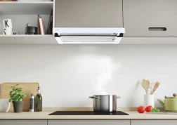 Teleskopická digestoř se stylovým bílým designem se perfektně hodí do každé moderní kuchyně.