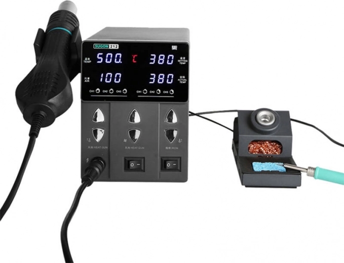 Sugon 212 kombinuje horkovzdušnou stanici a páječku T12, což z ní činí komplexní nástroj pro opravy a montáž elektroniky. Umožňuje nejen přesné pájení, ale také snadné odpájení a montáž SMD součástek. Tři programovatelná tlačítka vám umožní uložit si optimální nastavení teploty a vzduchu.