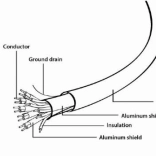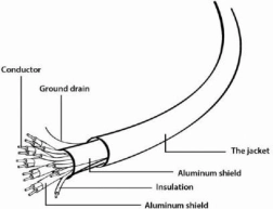 Detailní schéma zobrazuje vnitřní strukturu kabelu, včetně vodiče, odizolování a ochranného pláště.