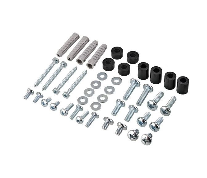 Balení obsahuje kompletní montážní sadu s hmoždinkami značky Fischer a vodováhou pro přesné vyrovnání. Produkt je navržen s ohledem na ekologii a udržitelnost, což potvrzuje i FSC certifikát a balení bez plastů.