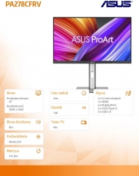 ASUS ProArt Display PA278CFRV je navržen s důrazem na profesionální práci s obsahem. Pokrytí 95 % DCI-P3 a 100 % sRGB zajišťuje věrné podání barev, ideální pro fotografy a videoeditory. Každý monitor je z výroby kalibrován s přesností Delta E < 2 a certifikován jako Calman Verified.