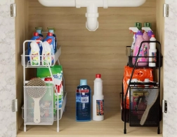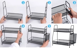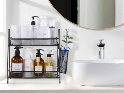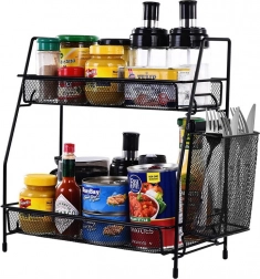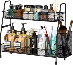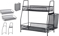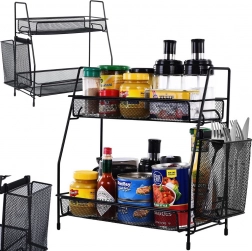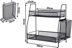 Stylový organizér z odolné kovové síťoviny pomůže maximálně využít vertikální prostor na lince, ve spíži i na toaletním stolku. Dvě úrovně pojmou koření, sklenice, lahve s olejem, omáčky nebo kosmetiku a parfémy. Boční košík je ideální na příbory, kuchyňské náčiní či kartáče a štětce.