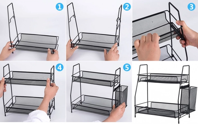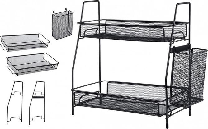 Udržte si pořádek na pracovní desce i v koupelně díky praktickému dvoupatrovému organizéru z kovové síťoviny. Nabízí dvě prostorné police, boční košík na příbory či štětce a stabilní konstrukci v elegantní černé barvě. Otevřený design zajišťuje výbornou přehlednost a cirkulaci vzduchu, takže koření, kosmetika i drobnosti budou vždy po ruce.