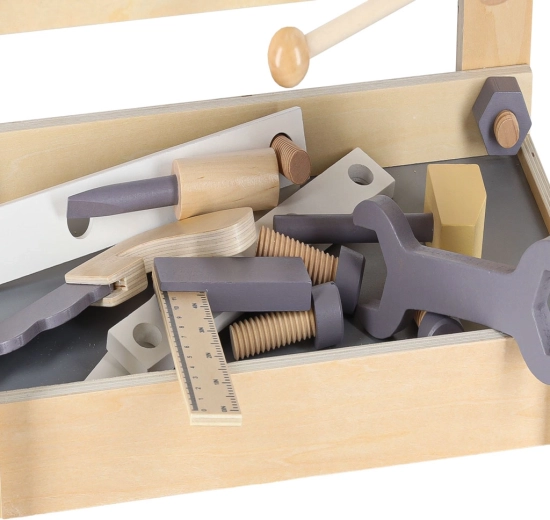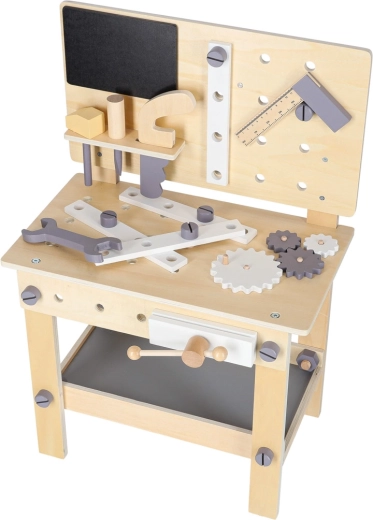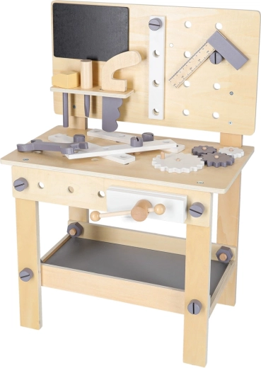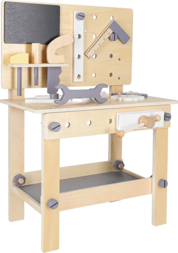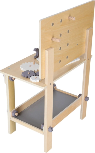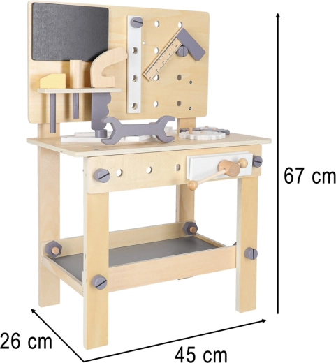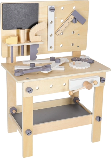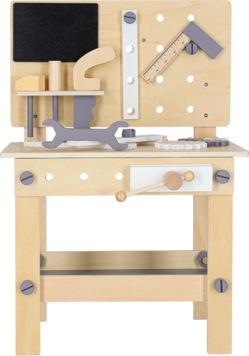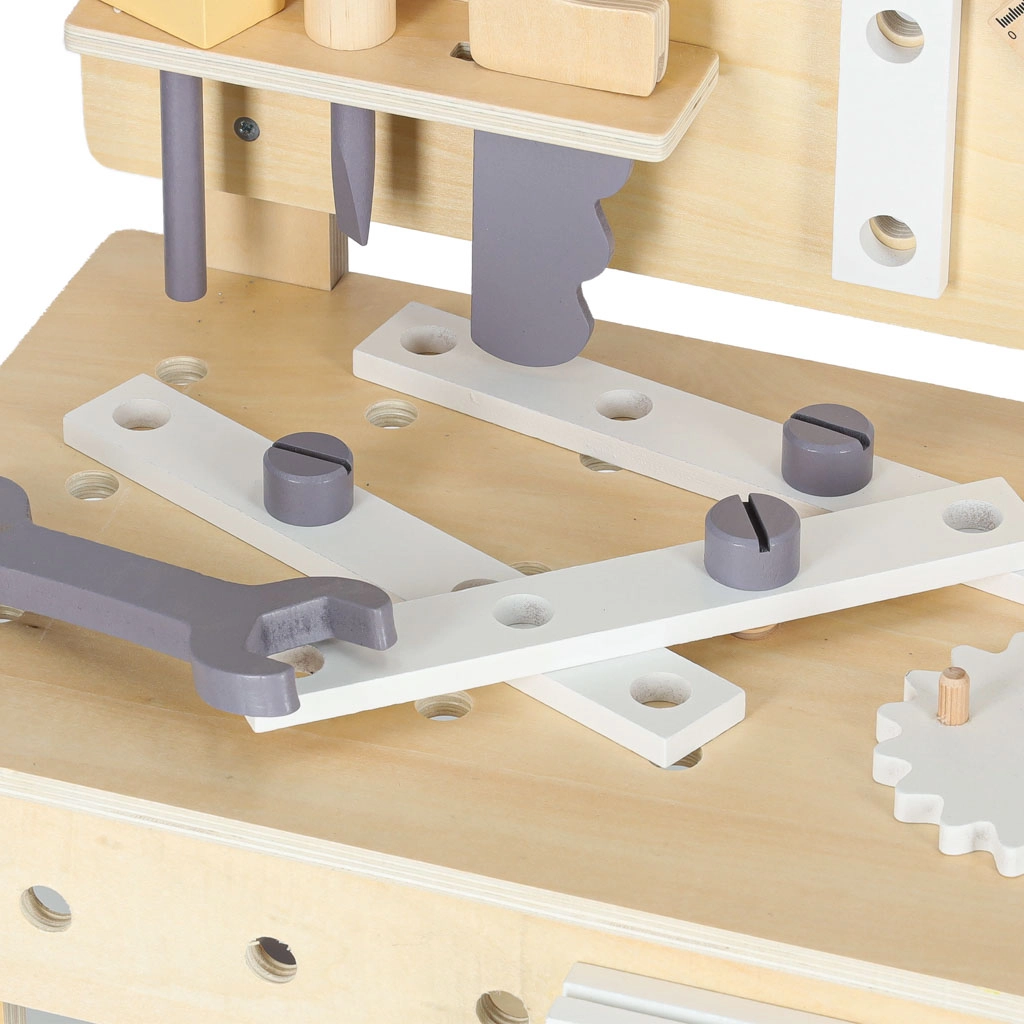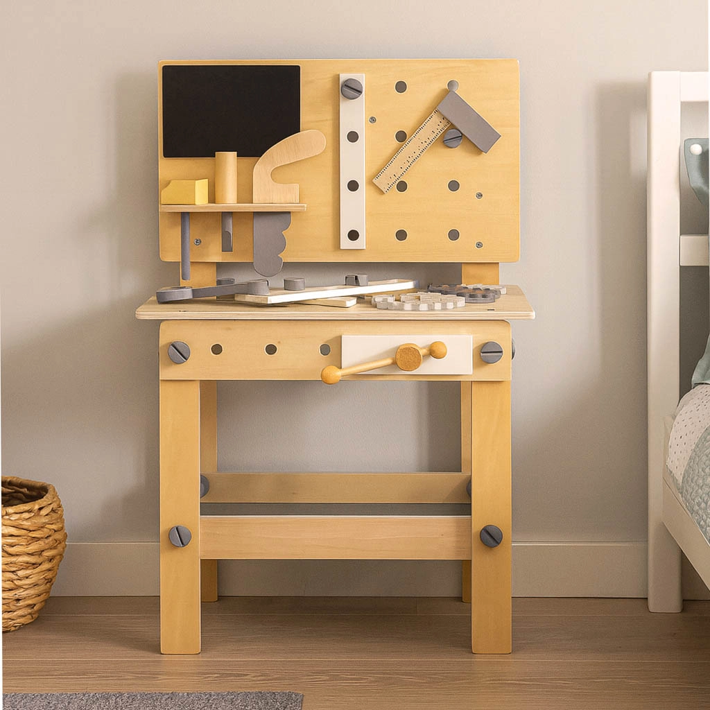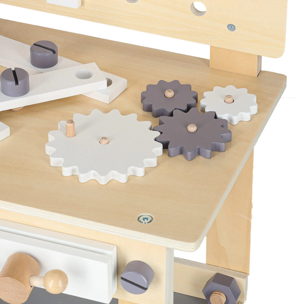Dřevěný dílenský stůl je ideální pro děti, které milují opravování a stavění. Díky bohaté sadě nástrojů a příslušenství si vyzkouší šroubování, zatloukání, měření i otáčení ozubených kol. Stabilní provedení v neutrálních barvách skvěle zapadne do dětského pokoje.
