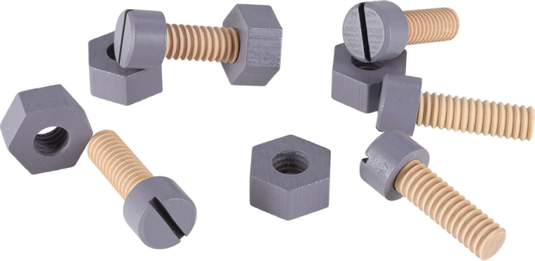 Pila, kladivo, šroubovák, francouzský klíč, měřítko, šrouby a matice – vše potřebné pro kreativní montáž a rozvoj jemné motoriky.