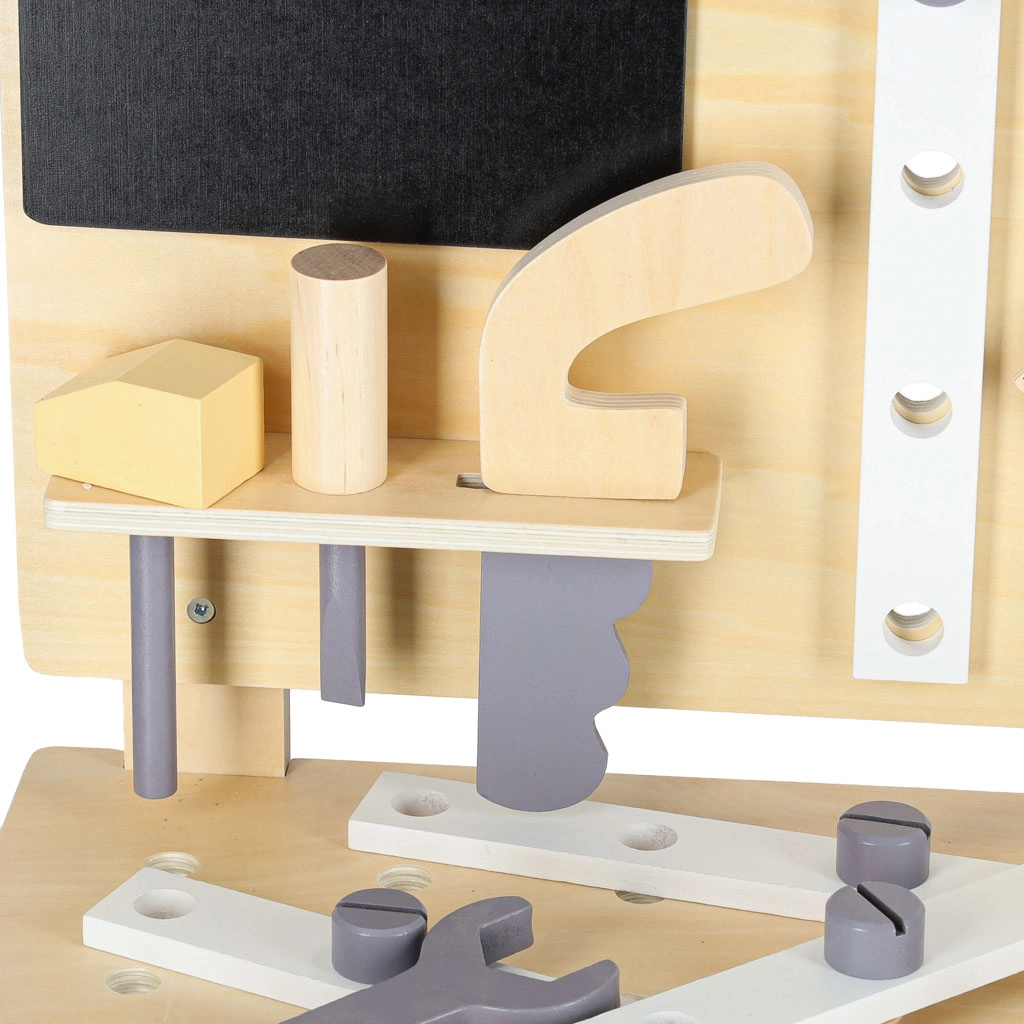 Stylový dřevěný pracovní ponk pro malé kutily přináší hodiny tvořivé hry a učení. Součástí jsou kladívko, šroubovák, klíč, pila, měřítko, šrouby, matice, zubatá kola a funkční svěrák. Pevná konstrukce, úložná police a děrovaná stěna podporují pořádek i rozvoj jemné motoriky a logického myšlení.
