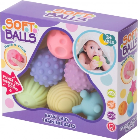 Sada obsahuje šest míčků s různými strukturami: malými a velkými výstupky, prohlubněmi, proužky a ježky s bodci. Učí koordinaci, rozpoznávání barev a tvarů, a poskytuje relaxační masáž, která uklidňuje a připravuje dítě ke spánku.