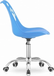 Otočná modrá plastová židle s kovovým podstavcem a dekorativními výřezy ve tvaru tlapek, ideální pro domácí kanceláře či dětské pokoje.