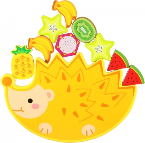Tato montessori balanční hra zabaví děti na dlouhé hodiny a zároveň je učí. Děti mohou ovoce navlékat na šňůrku, nebo je balancovat na ježkovi tak, aby se ovocná věž nezřítila. Kostka s barvami/obrázky přidává do hry prvek náhody a zábavné výzvy.