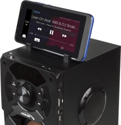 Pro pohodlné používání je tu praktické madlo, přehledné ovládání na těle a dálkový ovladač. Integrovaná baterie 2000 mAh zajistí až 3–4 hodiny přehrávání a dobíjí se jednoduše přes USB (5 V/1 A). Horní část reproduktoru lze využít jako stojánek na telefon, takže máte přehrávaný obsah stále na očích.
