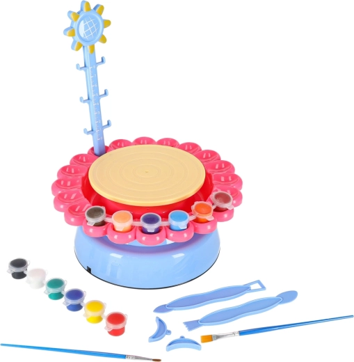 Hrnčířský kruh, 3× hlína (celkem 600 g), 12× barva, 2× štětec, 2× modelovací nástroj, měrka, USB kabel, fartuch