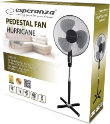Užívejte si svěží vánek s ventilátorem ESPERANZA HURRICANE, který díky modernímu vzhledu snadno zapadne do každého interiéru. Bezpečnost zajišťuje hustá přední i zadní mřížka, která prošla „dětským testem prstu“. Stabilní křížová základna s protiskluzovými koncovkami drží ventilátor pevně na místě i při delším provozu.
