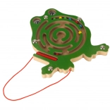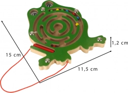 Tento dřevěný magnetický labyrint ve tvaru žabky zabaví děti na dlouhé chvíle doma i na cestách. Přiložené magnetické pero na šňůrce pomáhá vést barevné kuličky spletitými dráhami až do cílového místa. Průhledný kryt zajišťuje, že kuličky zůstanou vždy uvnitř hračky.