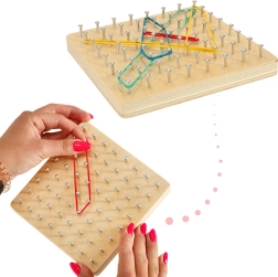 Objevte zábavný způsob, jak děti seznámit se základy matematiky – tvary, úhly a symetrie. Na dřevěné desce s hustou mřížkou kolíků děti napínají gumičky v různých délkách a barvách a vytvářejí obrazce podle karet nebo vlastní fantazie. Hra posiluje koordinaci oko–ruka, soustředění a logické uvažování.