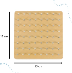 Deska je vyrobena z hladce broušeného dřeva bez ostrých hran. Kovové kolíky mají zaoblené zakončení, které chrání před poškrábáním a pomáhá udržet gumičky na místě. Díky kompaktním rozměrům se geoboard hodí jak domů, tak na cesty.