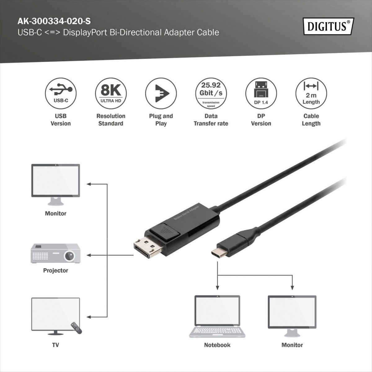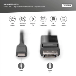 USB typ C - obousměrný kabel adaptér DisplayPort od společnosti Digitus podporuje přenos jak z USB typu C na DisplayPort, tak i obráceně. Díky tomuto kabelu připojíte například notebook s USB-C portem ke monitoru s DisplayPort rozhraním nebo desktop s DisplayPort výstupem k monitoru s USB-C portem. Tento adaptér je navíc zcela napájen přes USB, což eliminuje potřebu externího napájení.