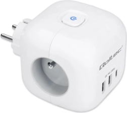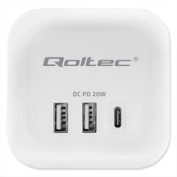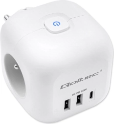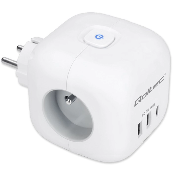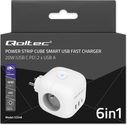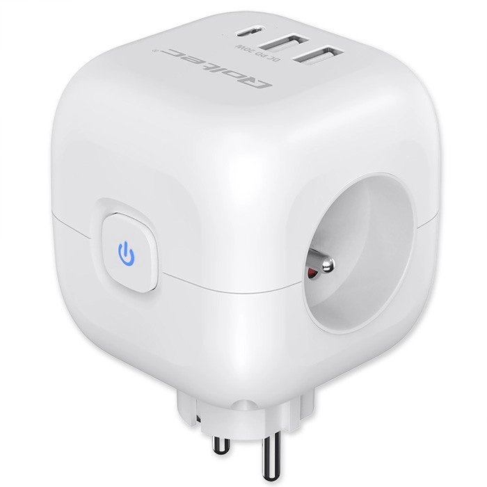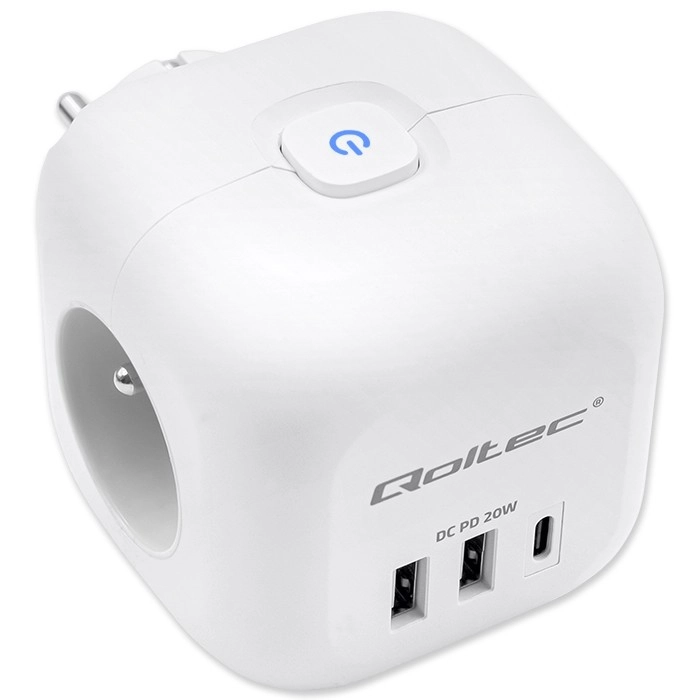 Prostorově úsporný design kostky napájení umožňuje snadné uspořádání 3 AC zásuvek na bocích pro komfortní připojení i větších konektorů. Na čelní straně jsou k dispozici 2 USB-A porty a 1 USB-C PD 20W port, takže můžete pohodlně nabíjet telefon, tablet nebo sluchátka bez potřeby dalších nabíječek.
