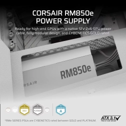 Bílý napájecí zdroj Corsair RM850e je plně modulární ATX zdroj s nízkou hlučností a certifikací ATX 3.1. Nabízí vysoký výkon a spolehlivost díky standardu Cybenetics Gold a vylepšenou správu kabelů.
