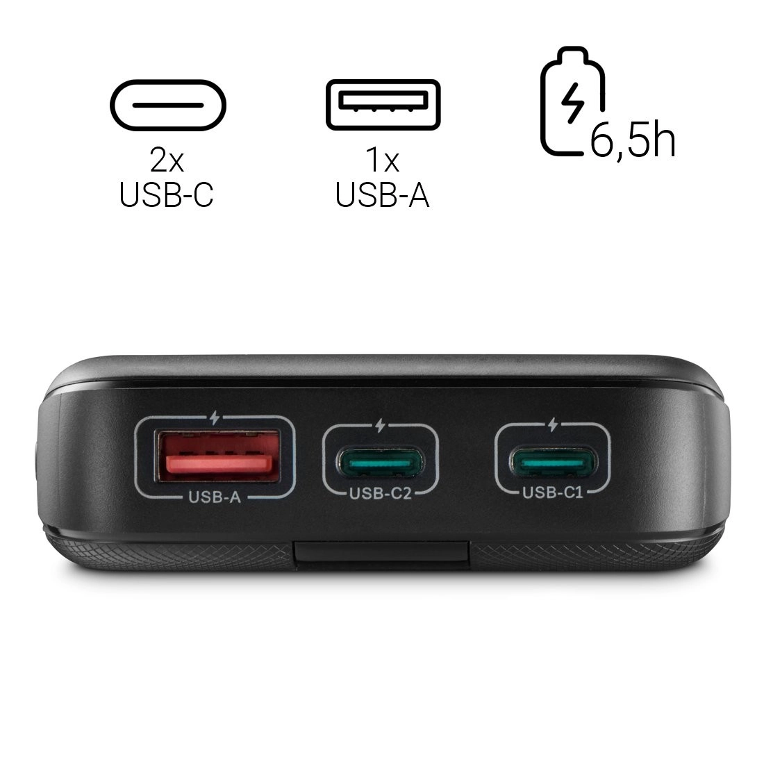 Naše powerbanka umožňuje nabíjení až třech zařízení současně díky dvěma portům USB-C a jednomu portu USB-A. To znamená, že můžete nabíjet telefon, tablet a chytré hodinky najednou, což je velmi praktické při cestování nebo náročném dni.
