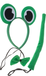 Tato hravá žabí sada promění vaše dítě během chvilky v sympatickou žabku. V balení najdete vše potřebné k rychlému převleku: čelenku s velkými žabími očky, zelený motýlek a ocásek. Díky univerzálním rozměrům a měkkému textilu se doplňky pohodlně nosí a snadno kombinují s oblečením, které máte doma.