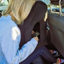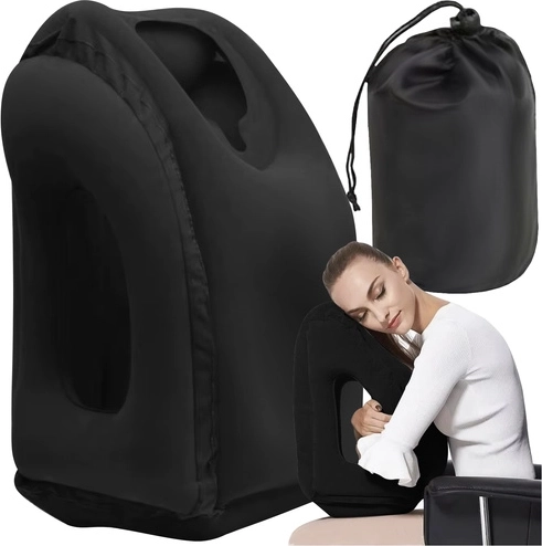 Výřez na obličej a otvory na ruce umožňují pohodlně podepřít hlavu a svobodně používat telefon. Ideální řešení pro dlouhé cesty, nabízí komfort a funkčnost v jednom.