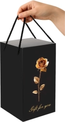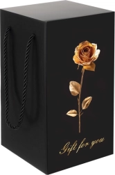 Elegantní dárkové balení: Růže je pečlivě zabalena v černém dárkovém boxu s designem zlaté růže, který je připraven ke každé příležitosti. Box je vybaven pohodlnými černými provázkovými úchyty.