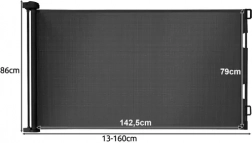 Praktická výsuvná bezpečnostní branka se síťovinou chrání děti i domácí mazlíčky před nebezpečnými zónami v domácnosti. Snadno se ovládá, šetří místo a díky černému provedení zapadne do každého interiéru. Roztažitelná až na 160 cm, výška 86 cm, odolná PVC síť a pevné kovové a plastové komponenty zajišťují spolehlivou zábranu u dveří, na chodbách i u schodišť.