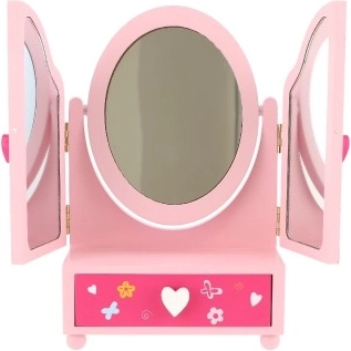 Roztomilé dětské toaletní zrcadlo se šperkovnicí v motivu PRINCESS potěší každou malou parádnici. Tříkřídlé zrcadlo s bočními díly pro lepší náhled, praktická zásuvka na poklady a pevné dřevěné zpracování v jemné růžové barvě. Ideální pro ukládání prstýnků, náramků a korálků a pro podporu kreativní hry.