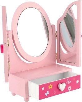 Dřevěná toaletka se šperkovnicí Princess je skvělým doplňkem do dětského pokoje. Středové oválné zrcadlo doplňují dvě postranní křídla pro pohodlné nastavení úhlu. Ve spodní části najdete praktickou zásuvku, kam si děti uloží své malé poklady. Jemné zdobení s motivy víl, květin a srdíček podporuje fantazii a radost ze hry.