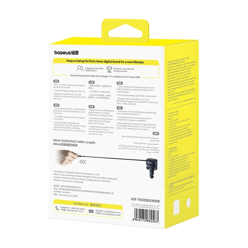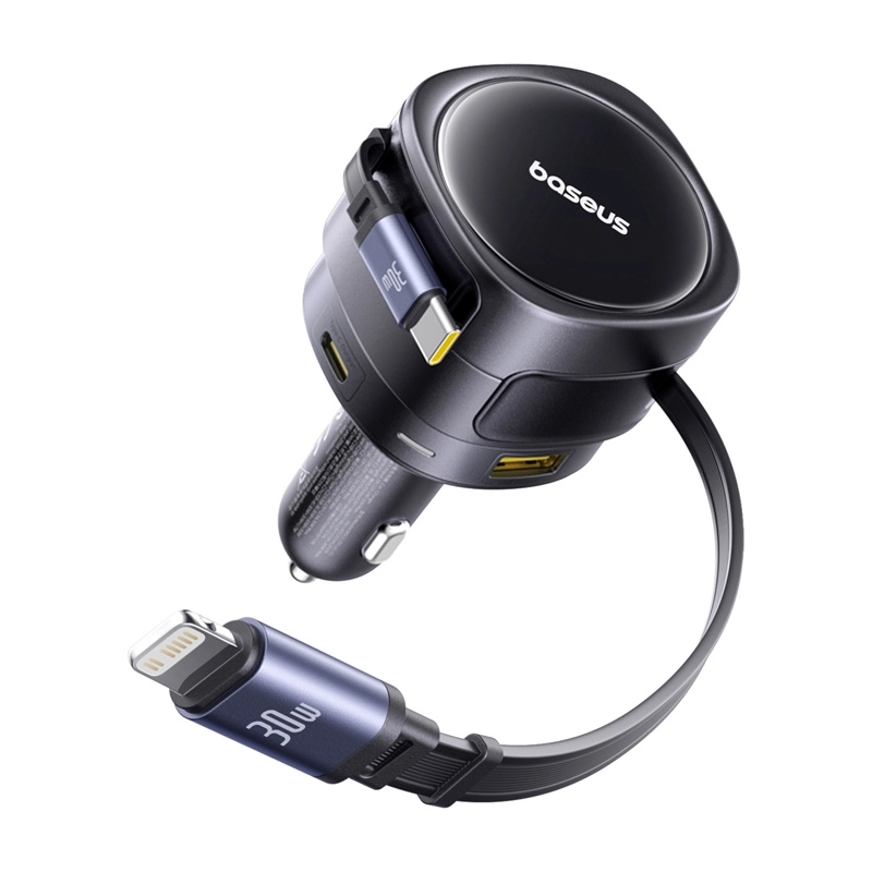 Baseus nabíječka do auta nabízí možnost nabíjení čtyř zařízení) najednou díky dvěma vestavěným kabelům (USB-C a Lightning) spolu se dvěma dalšími porty (USB-C a USB-A).