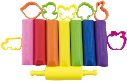 Sada obsahuje modelíny v různých barvách - růžová, červená, oranžová, žlutá, zelená, modrá a fialová.