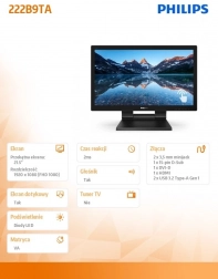Monitor Philips s úhlopříčkou 21,5 palců je vybaven technologií dotykového ovládání, která umožňuje 10bodový multitouch, což je ideální pro použití v interaktivních aplikacích. Díky použitému VA panelu nabízí monitor ostré detaily a široké pozorovací úhly, což zajišťuje skvělý zážitek z každého pohledu.