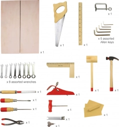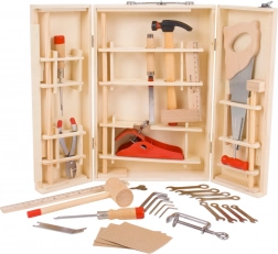 Dřevěný kufřík s nářadím obsahuje vše, co mladý kutil potřebuje. Obsahuje šroubováky, pily, klíče, kladiva, a mnoho dalších nástrojů. Vyrobeno z kvalitních materiálů a splňuje evropské bezpečnostní normy.